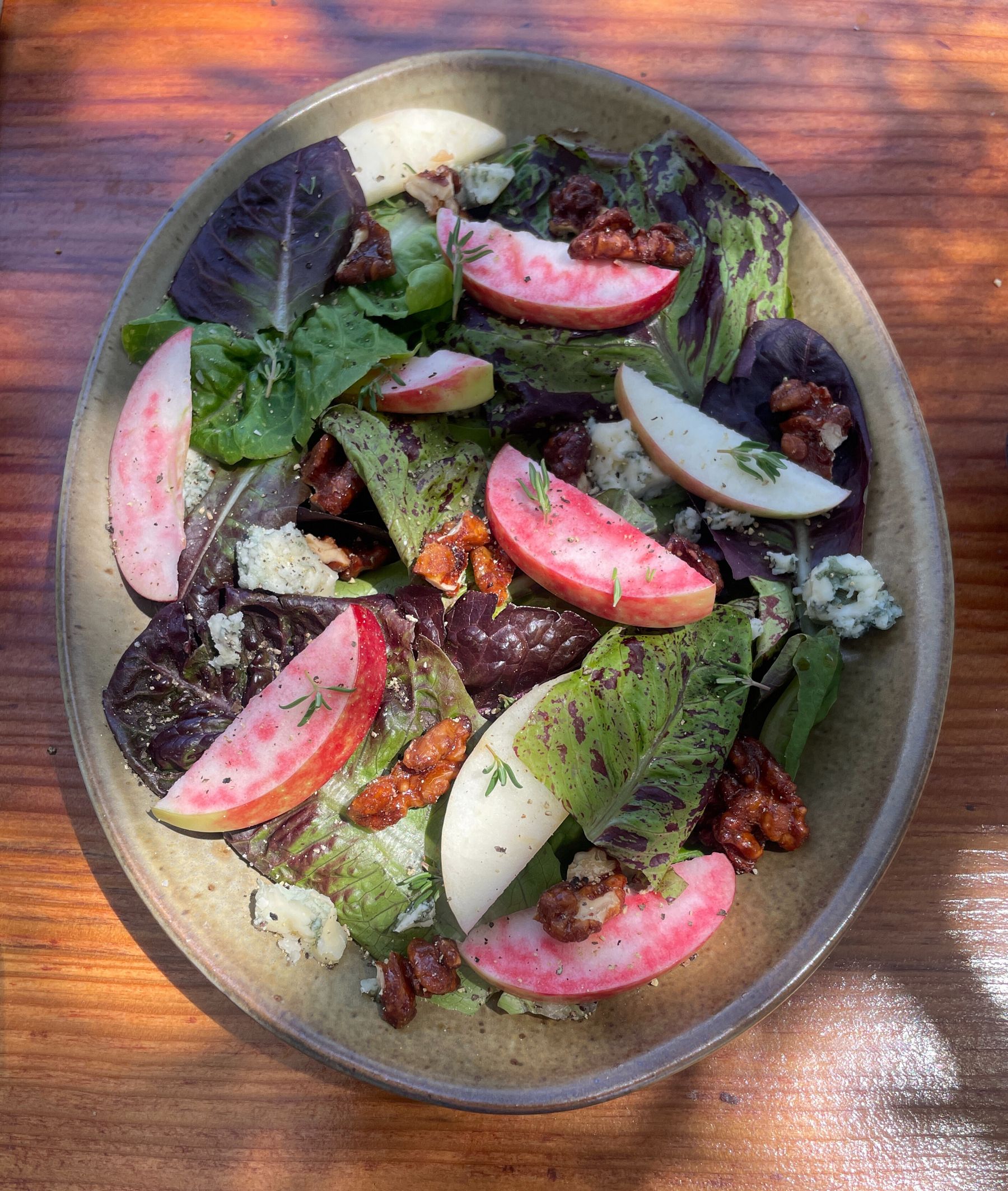 Spicy, bitter, funky, salty, sweet, crunchy: this salad hits all those flavor and texture notes you'd hope for in a classic autumn salad. Pair this with a a Pick a crisp, sweet apple to balance those big flavors, like Hudson’s Golden Gem, Hoople’s Antique Gold or Honeycrisp. Note that the candied walnuts or pecans need to steep overnight, so start them the night before you plan to serve the salad. Alternatively, toasted walnuts may be used in their place if you are short on time.