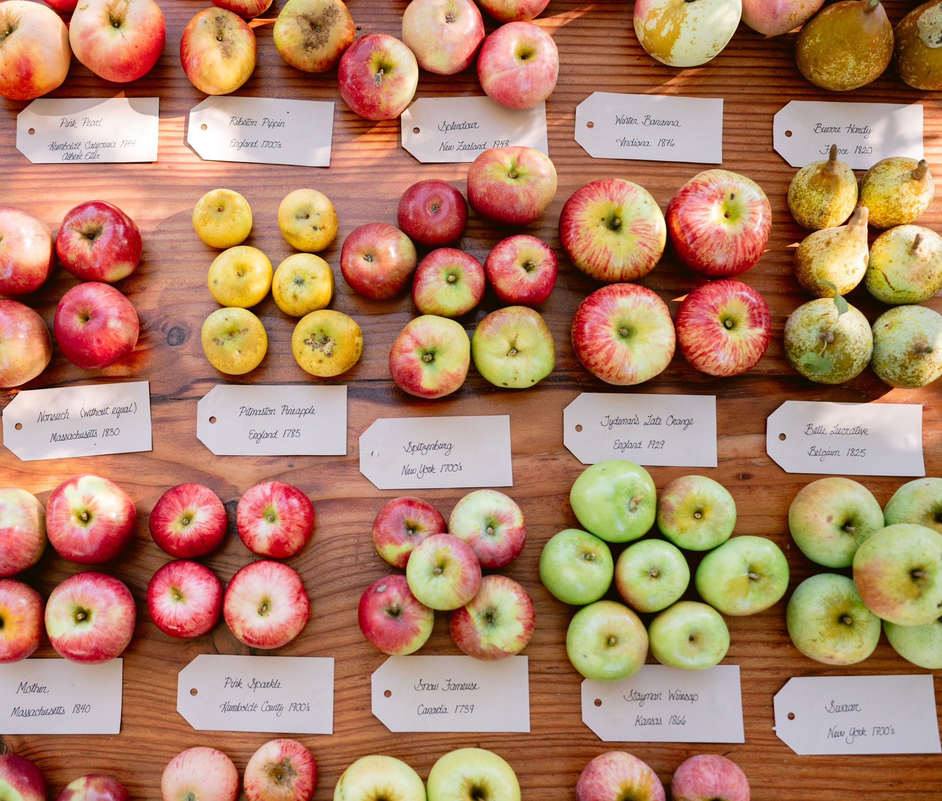Sixteen acres of apple varieties, including Honeycrisp, Fuji, and Pink Pearl, dot the rolling hills of the farm, interspersed with an array of beloved Heirloom apples. Dwarf apple trees were selected with hand harvesting in mind. A smaller portion of the orchards are devoted to Heirloom Asian and European pear varieties.